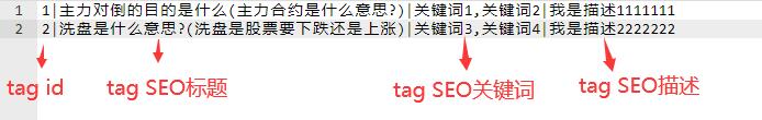 ①把你要修改的標簽的seo三要素寫到txt文件中(一般都是軟件生成的),txt文件內容格式為:tag標簽ID|關鍵詞|描述,一個標簽一行,如下截圖: