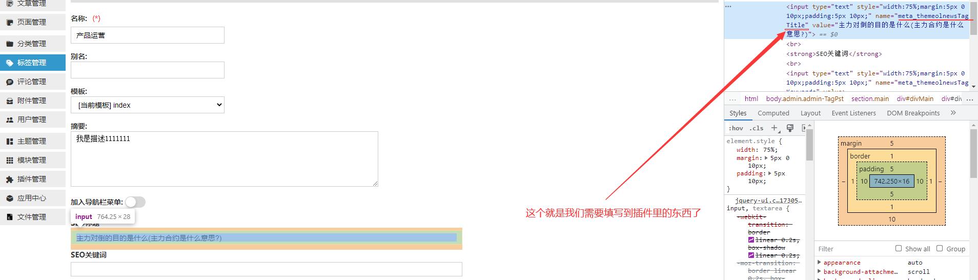 通過檢索代碼,我們找到對應選項的自定義字段是什么,然后輸入到插件里面保存即可,如SEO標題對應的是meta_themeolnewsTagTitle,那么我們就輸入themeolnewsTagTitle(把meta_去掉),如下圖: